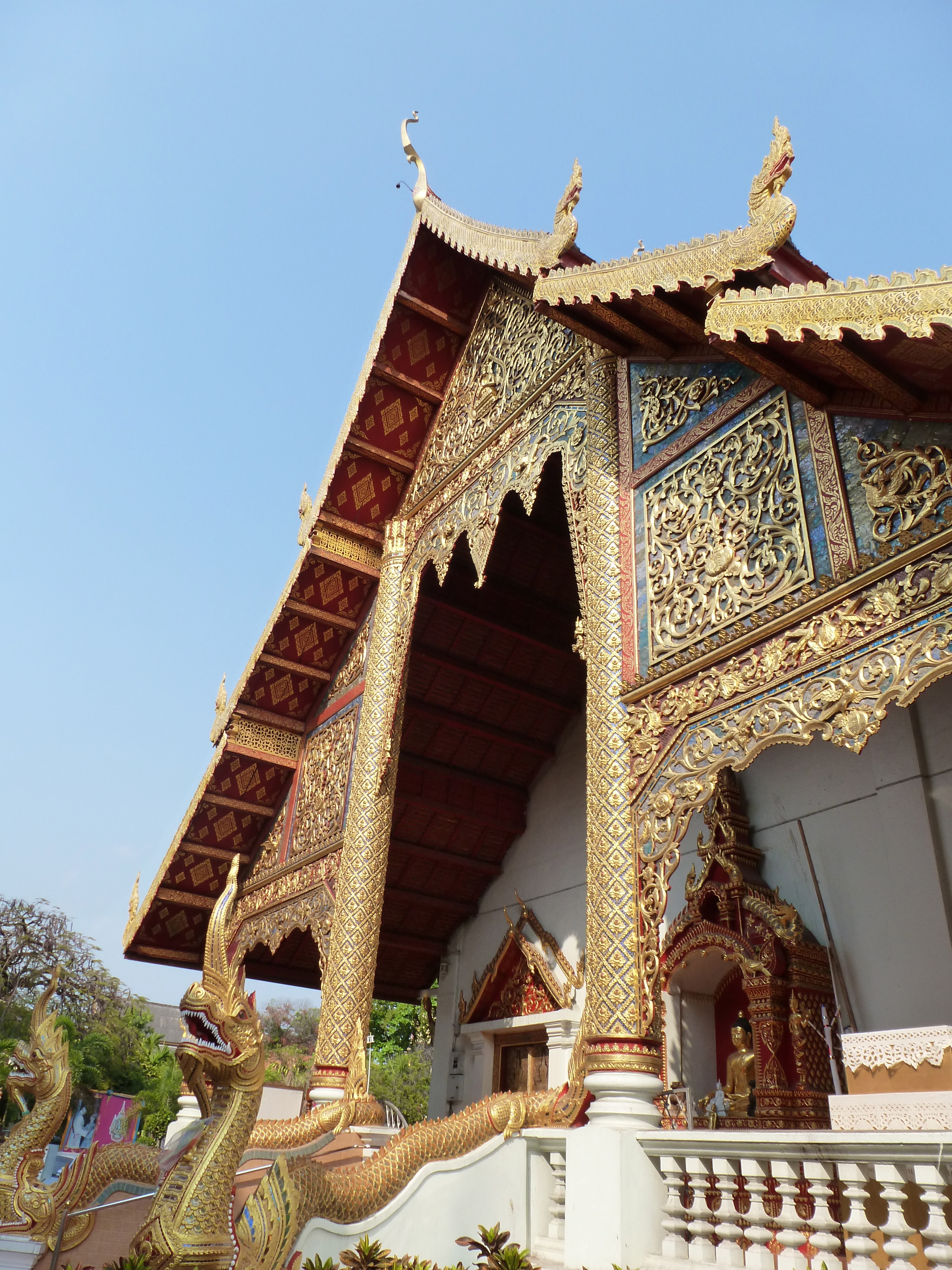 Arriving back in Bangkok, we regrouped the next day for the one hour flight north to Chiang Mai. An enchanting city at the foothills of the mountains and often used as a base for the adventure seekers. We were there for temple viewing, food, and shopping that included the night market locally known by Nimman (Nimmanhaemin). We stayed at the Meridian Hotel (knowing that we would be schlepping things back from our shopping). At is a nice hotel with a fantastic breakfast served each morning. Our room was comfortable and well priced. Within Chiang Mai is the old city where we found more temples. We fell in love with the Lanna architecture, and Wat Phra Singh (วัดพระสิงห์วรมหาวิหาร) is a perfect example of that. Completed in 1367, it is smaller compared to some of the large Wats in Bangkok, but orderly and charming.
