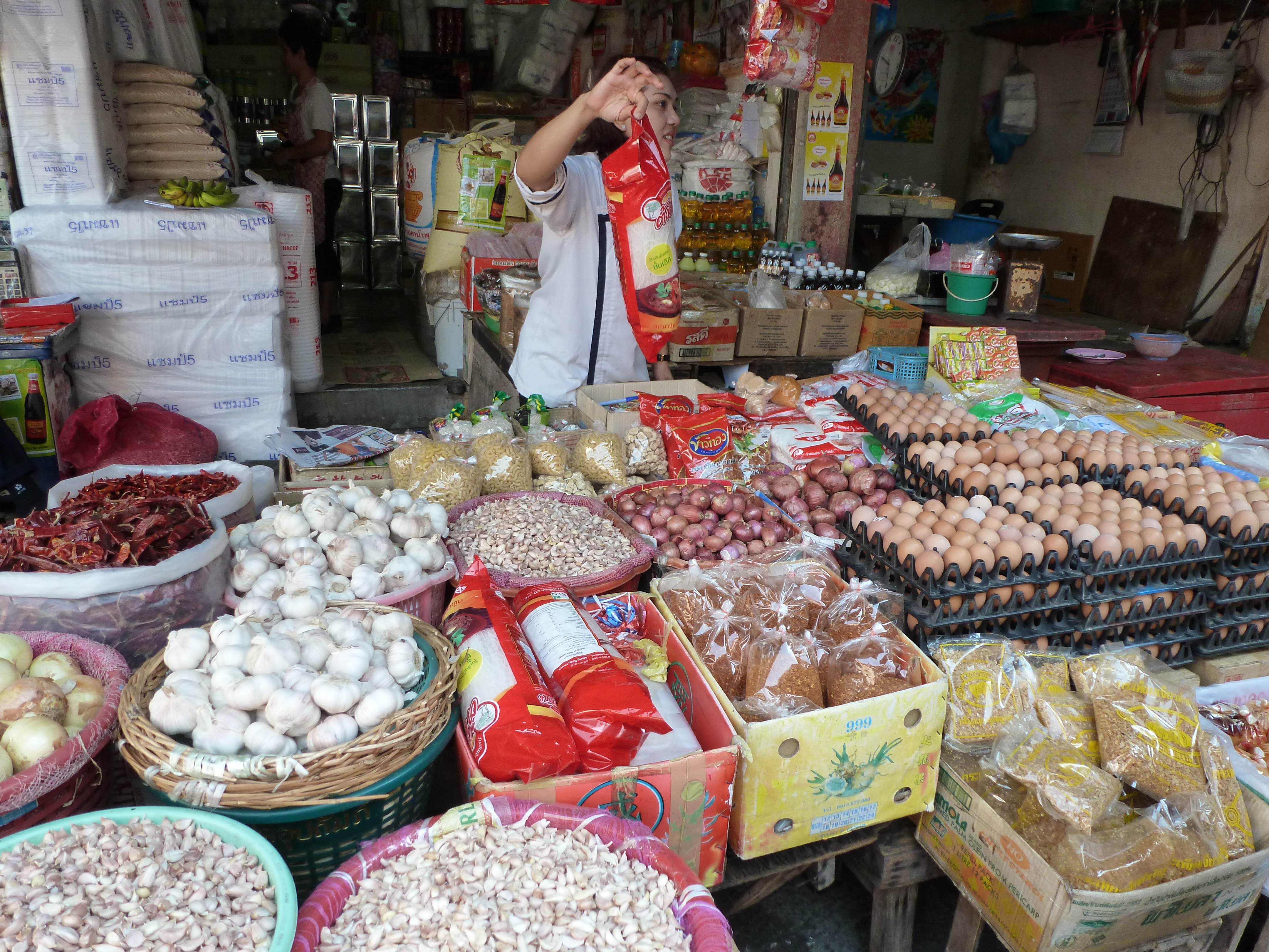 After the temples, we took an open aired pickup truck (I think it was about 60 baht – roughly $3 U.S.) to the edge of town to shop and eat. We found a small street that paralleled the river with shops including a nice shop with silk items. My wife bought a beautiful pair of silk slippers and she thanked the woman with a “kob khun ka (thank you). Women say “ka” afterwards and men say “krap”). Lunch was on the river’s edge at a casual restaurant with a wooden deck and delightful.