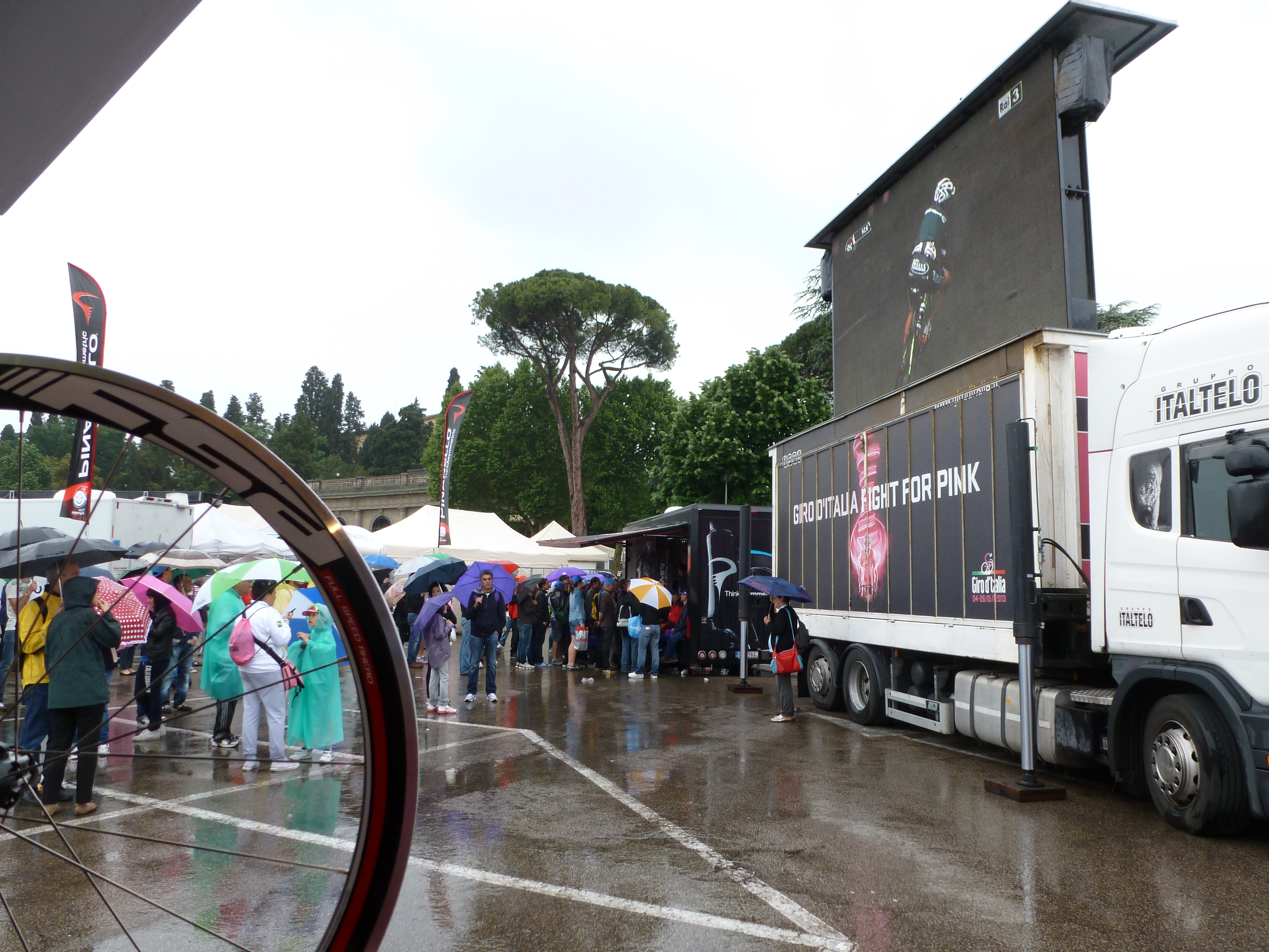 We happened to be there for a stage of the Giro d’Italia bike race and went to the finish area to watch. Arriving in the morning to get a good spot, we then walked around the vender area, ate and enjoyed the nice views of Firenze from the Piazzale Michelangelo: a beautiful, hilltop park. The race was underway miles away when it started to rain…and continued to rain.